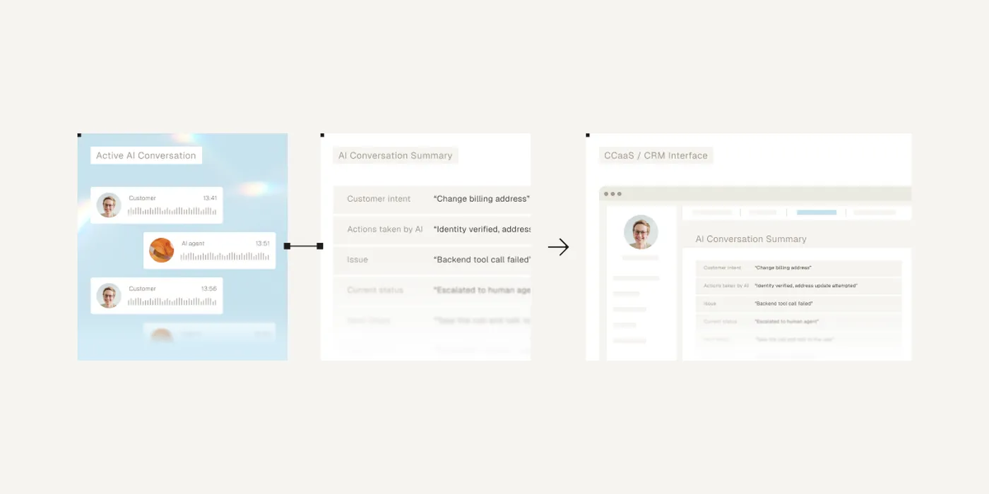 These summaries can be pushed directly into CCaaS platforms or CRM systems, reducing repetition for customers, cutting handling time for agents, and eliminating friction during escalation.